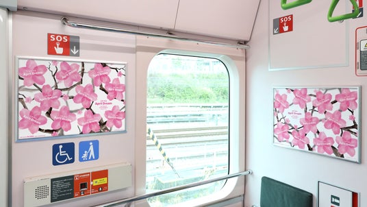 4099人の個人の夢と406社の企業・団体の夢は、中吊り(フィルムくり抜き加工)とドア横のポスター、そしてデジタルサイネージに掲示いたします。伸びた枝に桜の花が大きく咲いて、一つひとつの花にそれぞれの夢が書かれたデザインになりました。しかも今回、中吊りは枝の隙間を全てくり抜いて展示するため、幾重にも重なる桜のカーテンの向こうまで見渡せて、枝の向こうに夢をのぞける、新・桜仕様に進化しています。
