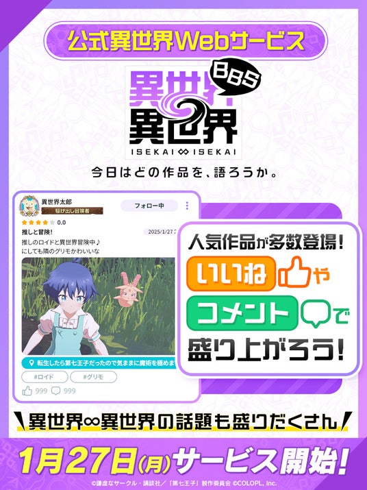 公式異世界Webサービス『異世界∞異世界BBS』は、自分らしく自由に異世界を楽しめる、新しいエンターテインメントサービスの一つです。現実世界とは異なる、剣や魔法などが登場する世界を舞台にした作品のファン同士でゆるくつながり、作品やキャラクターについて語り会える場所です。サービス開始は2025年1月27日(月)を予定しております。