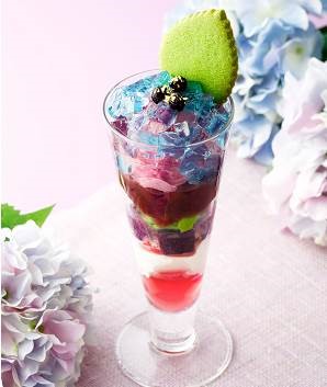 ラベンダーとブルーキュラソーのゼリーを散らし、きらきらと輝く紫陽花を表現したパフェ。