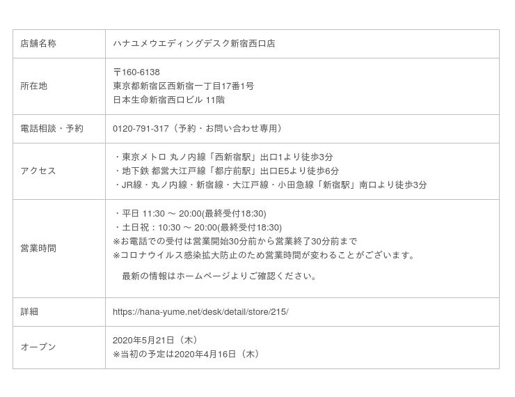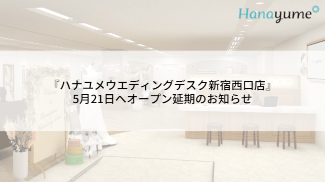 『ハナユメウエディングデスク新宿西口店』のオープンを心待ちにしていただいたお客様ならびに関係者の皆様にはご迷惑をおかけいたしますこと、深くお詫び申し上げます。