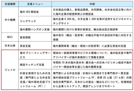 独立行政法人中小企業基盤整備機構(理事長:宮川正 本部:東京都港区)、日本貿易保険(以下、NEXI)および日本政策金融公庫(以下、日本公庫)が構築している「海外ビジネス支援パッケージ」について、日本貿易振興機構(以下、ジェトロ)が参加し、4機関での連携を12月19日(木曜)に開始しました。