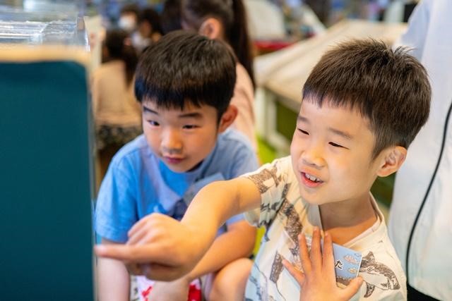 最後に、水槽と海との違いを説明。当法人スタッフが「海にはプランクトンや海藻などがあって自然の循環で水がきれいに保たれるけれど、水槽は機械を使って水を回してきれいにしたり、空気を入れて酸素を増やしたりします。それでも完全には良くならないから、1カ月に2~3回、海から新しい水を持ってきて、水を入れ替えているんだよ。海ってすごいよね」と語りかけると、大きくうなずく子どもたち。水族館飼育員の体験を通して、飼育員がいなくても美しさが保たれる海の偉大さにふれることができました。