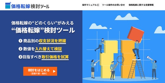 価格転嫁検討ツールは、中小企業・小規模事業者(以下、事業者)の経営改善や賃上げの実現に資する価格転嫁を検討するためのツールです。登録不要、利用料は無料です。