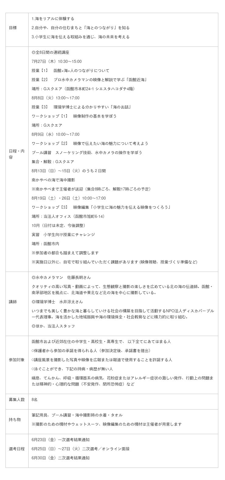 TBS「世界遺産」やNHK「ダーウィンが来た!」などの水中撮影を担当している日本トップクラスの水中カメラマン佐藤長明さんの指導を受け、中学生・高校生が海に潜って水中撮影し、映像制作に挑戦する講座です。数名ずつのチームに分かれて、自分たちでテーマを決めて撮影・編集を行い、最終的に自分たちで作った映像を使って小学生に「海の基礎知識や魅力を伝える授業」を行うことを目指します。