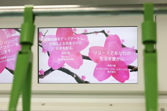 車内全体に伸びた枝に桜の花が大きく咲いて、一つひとつの花にそれぞれの夢が書かれたデザインに、中づり(フィルムくり抜き加工)とドア横のポスター、そしてデジタルサイネージにそれぞれの夢を掲示いたします。中づりは枝の隙間を全てくり抜いて展示するため、幾重にも重なる桜のカーテンの向こうまで見渡せて、枝の向こうに夢をのぞける、新・桜仕様に進化しています。デジタルサイネージを含めて、前年までの平面表示から、今年は遠近感を表現した3D表示にこだわり、車内全体に奥行きが感じられるつくりとなっています。これは、夢の背景にはそれぞれの人生や社史が抱える奥行きがあり、目の前に書かれた夢の先には、叶えたい想いや譲れない願いが一人ひとり一社一社にあることを表現しています。夢の理由や叶えたい想いにまで想像を巡らせることで、夢を眺める「夢見」にも深みが出ます。