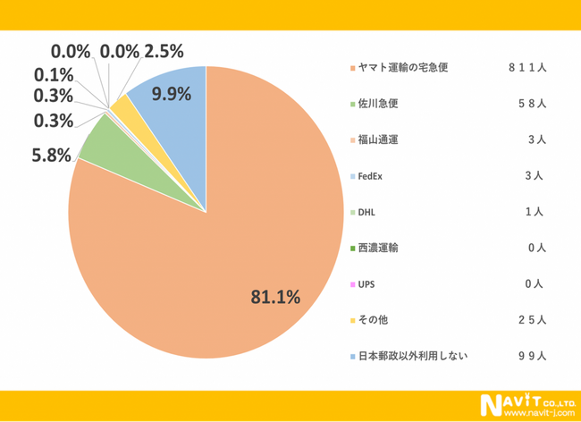 郵便以外に利用している郵送会社を尋ねたアンケートで1番多かったのは「ヤマト運輸の宅急便」で81.1%とシェアの大部分を占めていることがわかりました。次は「佐川急便」で5.8%という結果でシェア率が大きく違うことに驚きました。