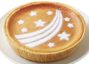 ホワイトチョコレートパウダーで天の川と星のデザインを描いたチーズケーキ。