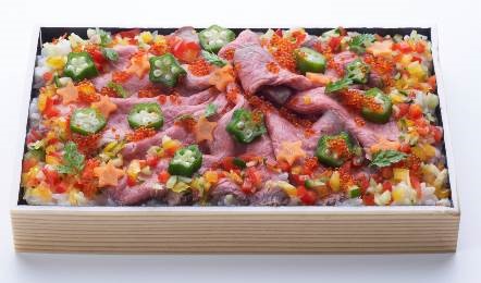 ローストビーフをトッピングした豪華なちらし寿司。オクラや星型のニンジン、パプリカなどで色鮮やかに。グレイビーソースでお召し上がりください。