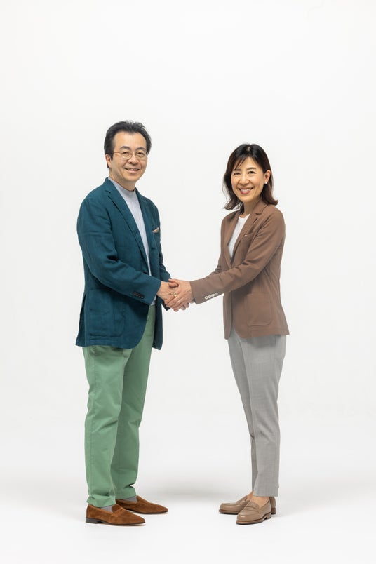 握手してほほえむ朝日新聞社の中村史郎社長(左)とライトアップショッピングクラブの若菜さおり代表取締役。中村社長の装いは、同社が取り扱うなかから若菜さんがコーディネートした=朝日新聞東京本社