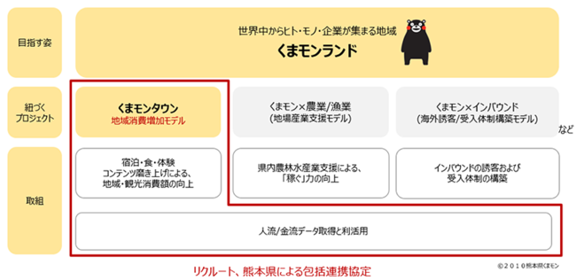 リクルートは、これらの目的実現(課題解決)のため、熊本県と共に、県内各地でおよそ3か年にわたり「くまモンタウン」実現に向け、大きく二つの取り組みを実行していきます。