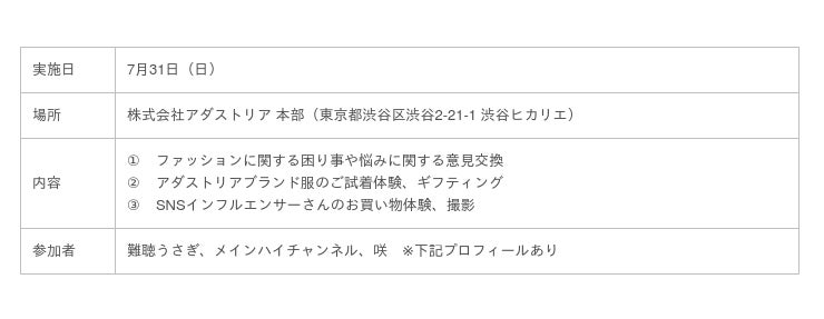 「Play fashion!」をミッションに掲げ、”グッドコミュニティ共創カンパニー”を目指す株式会社アダストリア(本部:東京都渋谷区渋谷2-21-1、代表取締役社長:木村 治)が展開するインクルーシブファッションプロジェクト『Play fashion! for ALL』は、障がいもつインフルエンサーや介助に携わる方々を招待し、障がいの有無関係なくすべての人がもっとファッションを楽しむ、をテーマに、ファッションに関する困り事や意見を交換するイベントを7月31日(日)に実施いたしました。
