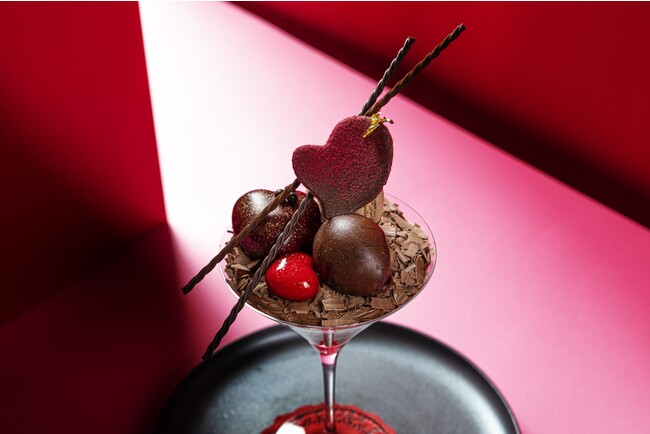 チョコレートをベースとしたパフェは、「たくさんの愛のカタチ=Shape of LOVE Parfait」をコンセプトにさまざまなハートのスイーツで表現しました。ショコラクランブルやショコラクリームをベースに、上部にはハートのベリームースや紅茶風味のチョコレートムース、チョコレートゴーフルのほか、チョコレートのマカロンやアイスをアーティスティックに飾っております。底の部分には、ルイボスオレンジジュレの中にハート型のラズベリージュレが隠れているなど、ハートを探しながらスプーンですくう度に味わいが変わるパフェをお楽しみいただけます。