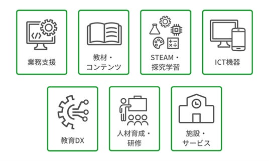 学校・教育機関、企業の人事・研修部門などの方に向けた日本最大級の教育分野の展示会です。年に2回、東京ビッグサイト、インテックス大阪で開催。教育現場の課題に合わせ、業務支援、教材・コンテンツ、探究学習・STEAM教育、ICT機器、教育DX、人材育成・研修、施設・サービスの7つのエリアで構成しています。