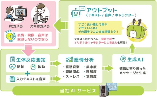 パソコンやスマートフォンに付属のカメラで計測した生体データを基に、学習者の感情状態をリアルタイムで解析し、生成AIが個別最適化されたフィードバックを提供する画期的なサービスです。ひとりひとりの感情状態の変化からAIが能力・適性・性格などを分析し、学習者に合わせてパーソナライズされた学習支援を自動的に提供できるようになります。