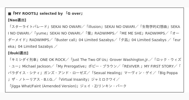 今回、G overで作詞・作曲を担当するNao、Ibukiそれぞれが影響を受けた楽曲をプレイリスト化した『MY ROOTS』selected by 「G over」を公開。