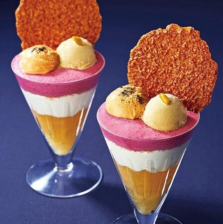 トップには北海道が誇る牛乳を使った濃厚なピスタチオ&キャラメルアイス。カシスムースの下にはミルクアイスが隠れ、りんごのコンポートでフィナーレ。札幌で評判のシメパフェ店から、自分で盛り付ける可憐な一品が初登場!