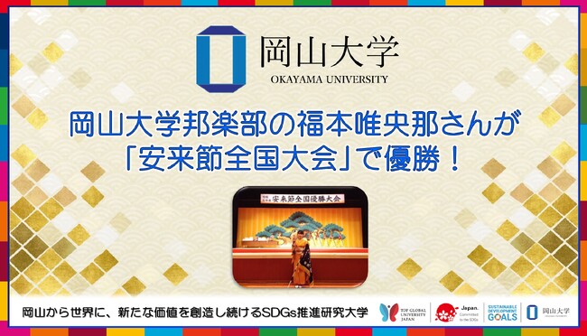 国立大学法人岡山大学は、国連の「持続可能な開発目標(SDGs)」を支援しています。また、政府の第1回「ジャパンSDGsアワード」特別賞を受賞しています。地域中核・特色ある研究大学:岡山大学にご期待ください