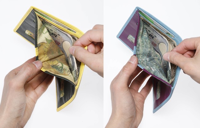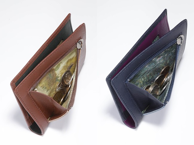 カードポケットを縦に配置することで、20枚のカードを入れてもカード10枚分の薄さにとどまる「カードをたくさん入れてもさらに薄い財布NEO」をベースにデザインしました。財布の表革にはそれぞれの名画が持つ色のイメージカラーの牛革を使用。傷や汚れが目立ちにくい型押し加工を施した高級感が漂うデザインです。カードポケットや札入れ、小銭入れの内側には名画そのものを大胆にプリント。男女を問わず使いたくなる華やかな財布に仕上げました。