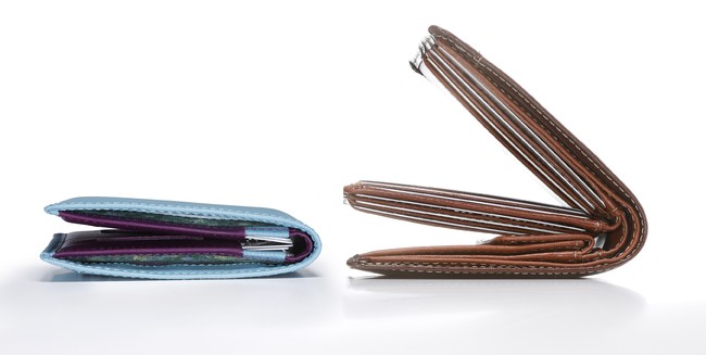 左がカードを20枚入れた本品、右が同数のカードを入れた一般的な二つ折り財布。一般的な財布では閉じることも難しいですが、本品はしっかり閉じて薄さもキープしています。