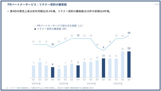 第4四半期の売上高は前年同期比で25.4%増、リテナー契約の顧客数は15件と前年同期比4件増でした。また、正社員数は前期比で5名増となりました。データとAIを活用したサービス開発、そしてメンバーの能力トレーニングを両輪で進めながら、顧客創造に挑んでいます。