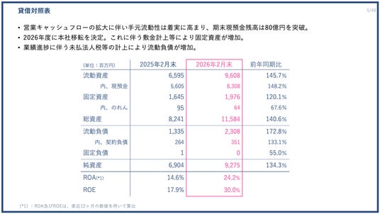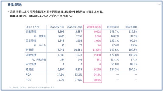 バランスシートについて、営業活動により現預金残高が前年同期比48.2%増の83億円まで積み上がっております。ROEは30.0%、ROAは24.2%といずれも高水準となっています。