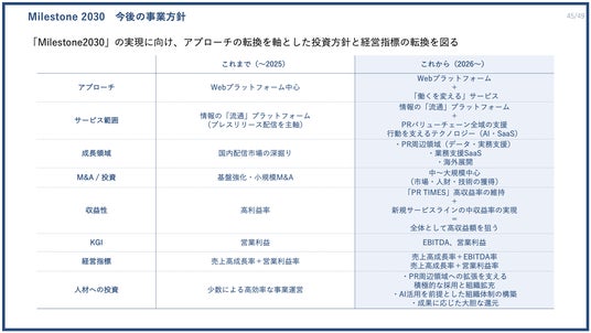 Milestone 2025では「PR TIMESのWebプラットフォームの深掘り」をやり抜き、KGIである営業利益35億円を達成しました。Milestone 2030では、PRバリューチェーン全域への拡張、業務支援SaaS、海外展開へとアプローチを広げます。それに伴い、KGIにEBITDAを加えます。積極投資のフェーズでは、減価償却費や株式報酬費用が増加し、営業利益だけでは事業本来の稼ぐ力が見えにくくなります。EBITDAを併用することで、投資の実態と成果をより正確にお伝えしてまいります。