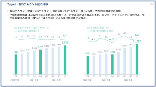 2026年2月末時点の有料アカウント数は1636アカウントで、前四半期比で88アカウント増(5.7%増)となりました。決算発表での開示以来、20四半期連続の増加を示しており、堅調な推移が続いております。1アカウントあたりの平均利用単価は1万1287円(前四半期比8.4%増)で、計測以来の過去最高を更新しています。エンタープライズプランの利用ユーザーや新規案件の増加、BpaaSによる高付加価値化が寄与しました。