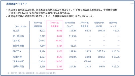 営業利益は前期比93%増で中期経営目標「Milestone2025」で掲げた営業利益35億円を上回り達成