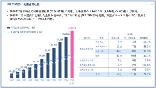 また、2025年に日本国内の証券取引所に新規上場した企業64社の内、51社(79.7%)が「PR TIMES」を利用しています。特に、東証グロース市場への新規上場企業42社の内、38社(90.5%)が2025年に「PR TIMES」を利用しています。