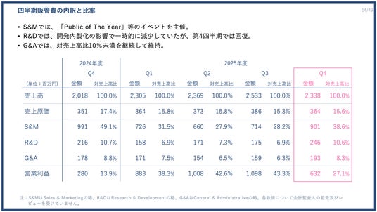 S&Mは、「Public of The Year」等のイベントを実施し、売上高比率38.6%となりました。R&Dでは、開発内製化の影響で一時的に減少していましたが、第4四半期では回復し、売上高比率10.6%となりました。G&Aは売上高比率8.3%と10%未満をキープしています。