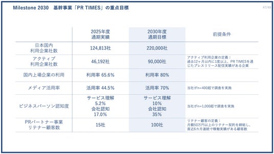 PR TIMESのポテンシャルを踏まえた、2030年度の重点目標を設定しました。PR TIMESの利用企業社数は12万4813社から22万社へ、アクティブ利用企業は4万6192社から9万社へ、国内上場企業の利用率は65.6%から80%へ。そしてPRパートナー事業のリテナー顧客数は15社から100社へ。19期連続増収という成長の連続性と、まだ伸びしろの大きい国内PR業市場、この2つが私たちの自信の根拠となっています。