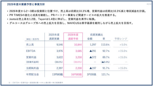 PR TIMESの進化と成長を継続し、PRパートナー事業など関連サービスの拡大を推進します。Jootoは売上高を1.2倍、Tayoriは1.4倍に伸ばし、営業利益を黒字に転換します。グルコースはグループ外への売上拡大を目指し、NAVICUSは黒字基調を維持しながら売上拡大を実現します。