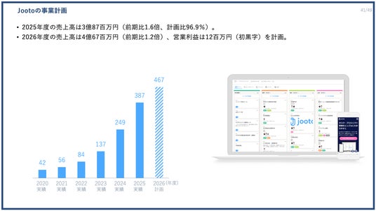 Jootoの事業計画について、2025年度の売上高は3億8700万円(前期比1.6倍、計画比96.9%)となりました。