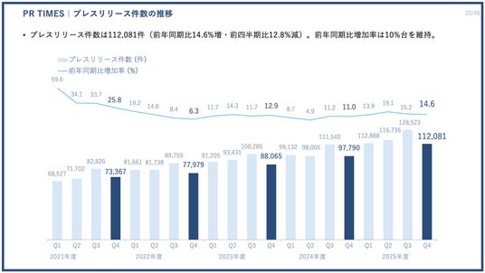 2025年度第4四半期は、11万2081件のプレスリリースを配信いただき、前年同期比で14.6%増、前四半期比で12.8%減となりました。プレスリリース件数の成長率は10%台を堅持しています。