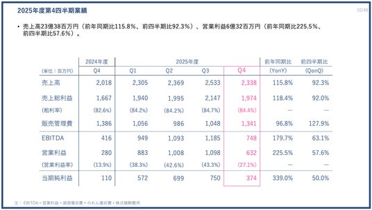 2025年度第4四半期の業績は、売上高が23億3800万円、EBITDAが7億4800万円、営業利益が6億3200万円、当期純利益が3億7400万円となりました。前年同期比では、売上高が115.8%、EBITDAが179.7%、営業利益が222.5%、当期純利益が339.0%と大幅な増加となりました。前四半期比では、売上高92.3%、EBITDEBITDA63.1%、営業利益57.6%、当期純利益50.0%となりました。