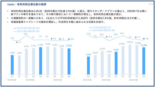 2026年2月末時点の有料利用企業社数は2451社に達し、前四半期比で73社(2.9%)減少いたしました。現行スタンダードプランの廃止と、2026年7月以降に新プランへの移行を進めており、その移行検討において一部解約が発生したことが要因となります。1社あたりの平均利用単価は、大規模契約の一部縮小があり、1万1856円と、前四半期比では7.8%減少しましたが、前年同期比では19.2%増となっています。有識者監修テンプレートの提供を開始し、利活用を手軽に進められる状態を目指しています。