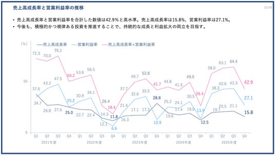 売上高成長率(15.8%)と営業利益率(27.1%)の合計は42.9%の高水準となり、成長と収益性の両立が実現しています。収益性を高めながら、成長を加速することができました。当社では、今後も積極的かつ規律ある投資により、事業成長と利益向上の両立を目指す方針です。