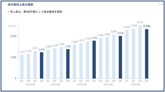 四半期売上高の推移では、堅調に成長基調を継続しているのがご確認いただけます。四半期売上高は、第4四半期としては過去最高を更新しました。