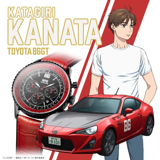 『MFゴースト』の主人公、片桐夏向が乗車する「TOYOTA 86GT」をイメージ。針やベゼル、ストラップ表面を車体と同じレッドカラーで表し、公道で疾駆する姿を彷彿とさせます。一方で、ケース全体は引き締まったマットブラックに。ダイヤル中央には格子状のパターンを取り入れ、「TOYOTA 86GT」の特徴的なフロントグリルを連想させます。12時位置に置かれた「86」も印象的です。