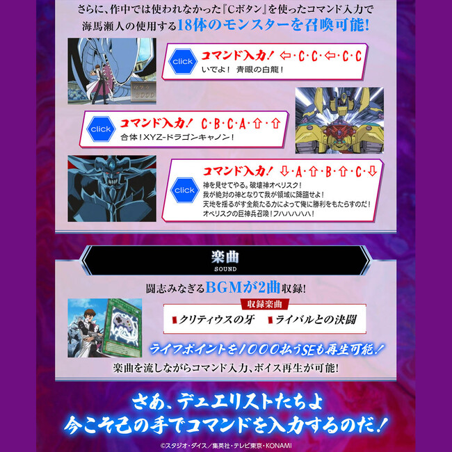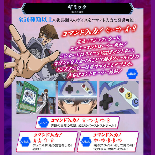 十字ボタン、Aボタン、Bボタンを使用し、コマンドを入力することで、コマンドに連動した海馬瀬人(演:津田健次郎)の新規撮り下ろしボイスを50種類以上再生することができます。