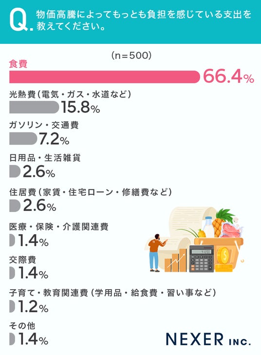 ■物価高騰によってもっとも負担を感じている支出、66.4%が「食費」と回答