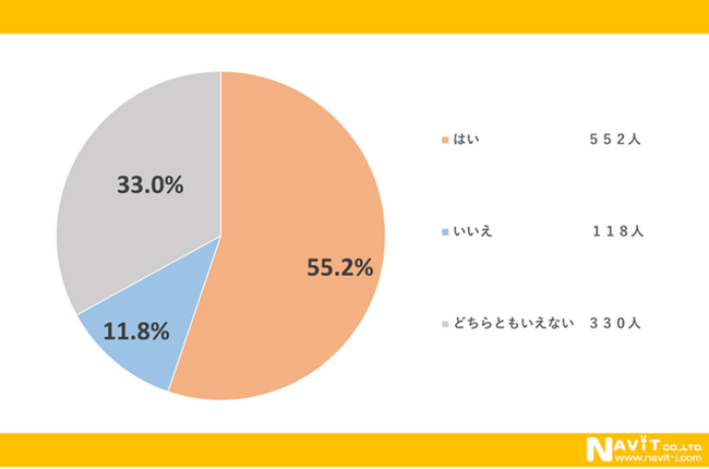 あなたは生活習慣病に気をつけていますか?というアンケートに対して「はい」と回答された人が半数以上で55.2%でした。「いいえ」と答えた人が11.8%でしたので、健康に対する意識の高さが伺えます。