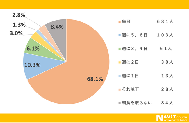 こちらは、朝食に関するアンケートです。週に何回朝食をとるかとたずねたところ「毎日」と回答された人が1番多く68.1%という結果になりました。次に多かったのが「週に5、6日」で10.3%で毎日朝食をとる人と合わせると78.4%と8割近くの人が、ほぼ毎日朝食をとっている結果になりました。