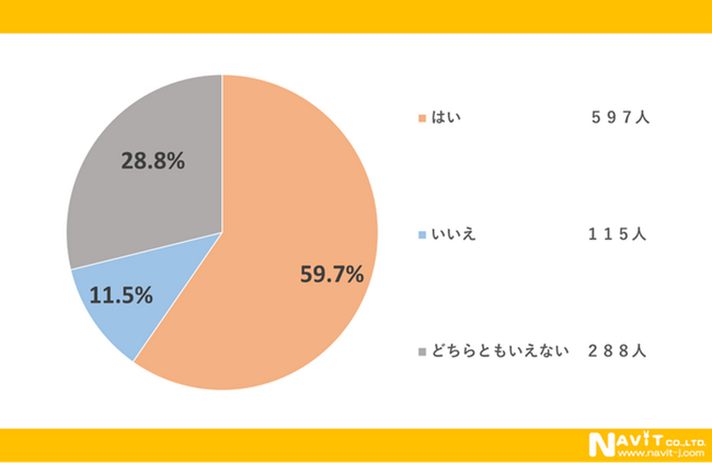 普段の食生活に関するアンケートで、食事に気をつけていますか?とたずねたところ「はい」と回答された人が59.7%と高い水準で食事に気をつけているということがわかりました。反対に「いいえ」と答えた人が11.5%という結果になりました。