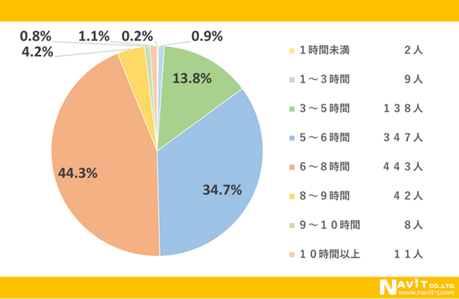 平均睡眠時間に関するアンケートで1番多かったのは「6~8時間」で44.3%でした。次に多かったのは「5~6時間」で34.7%で「3~5時間」が13.8%という結果になりました。