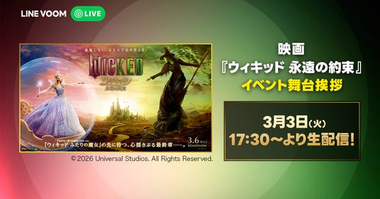 LINEヤフー株式会社は、「LINE」アプリ内のショート動画プラットフォーム「LINE VOOM」にて、2026年3月3日(火)に、映画『ウィキッド 永遠の約束』(原題:Wicked: For Good)の日本語吹替版最速上映イベントの模様を独占ライブ配信します。