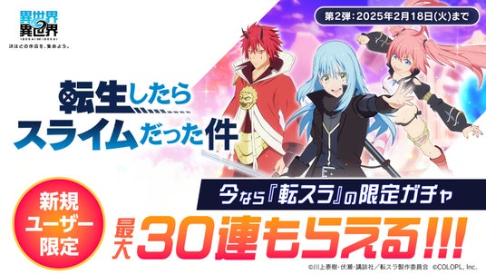 ゲーム内では、2月7日(金)より「1stシーズン」第2弾として「転生したらスライムだった件」が登場しており、リムルとベニマル、ミリムがキャラクターとして登場しております。また、「1stシーズン」登場作品の主人公たちから2体のキャラクターが無料で貰えるキャンペーンを実施しており、ゲーム開始時にチュートリアル突破でガチャ30連分が貰えるなど様々なプレゼントもご用意しております。