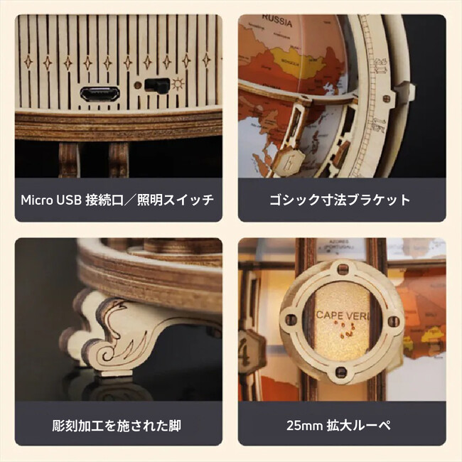 GeeGlobeの各パーツは木製で繊細にカット処理されています。