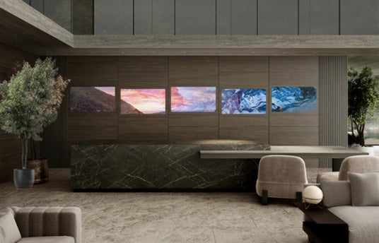 「ダブルビュー(R)フィルム」は、TOPPANが建装材事業で培ってきた木目等の表現方法を進化させた透過加飾技術を使用した化粧シートです。この「ダブルビュー(R)フィルム」によってディスプレイの存在を隠しながら、従来同様のコンテンツ表示を可能にしました。本展示会では、インテリア向けに「ダブルビュー(R)フィルム」を用いたモックアップを展示します。情報を表示するディスプレイとインテリアがシームレスに一体化することで、コンテンツが空間に溶け込む上質なインテリア空間を実現します。