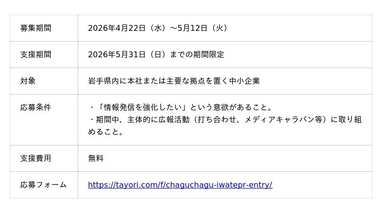 このたび3つの支援プログラムの1つ、岩手県内の中小企業を対象とした「広報・PR伴走支援プログラム」の提供を開始し、支援を希望する参加企業(限定5社)の募集を2026年4月22日(水)より開始いたしました。応募締め切りは5月12日(火)です。